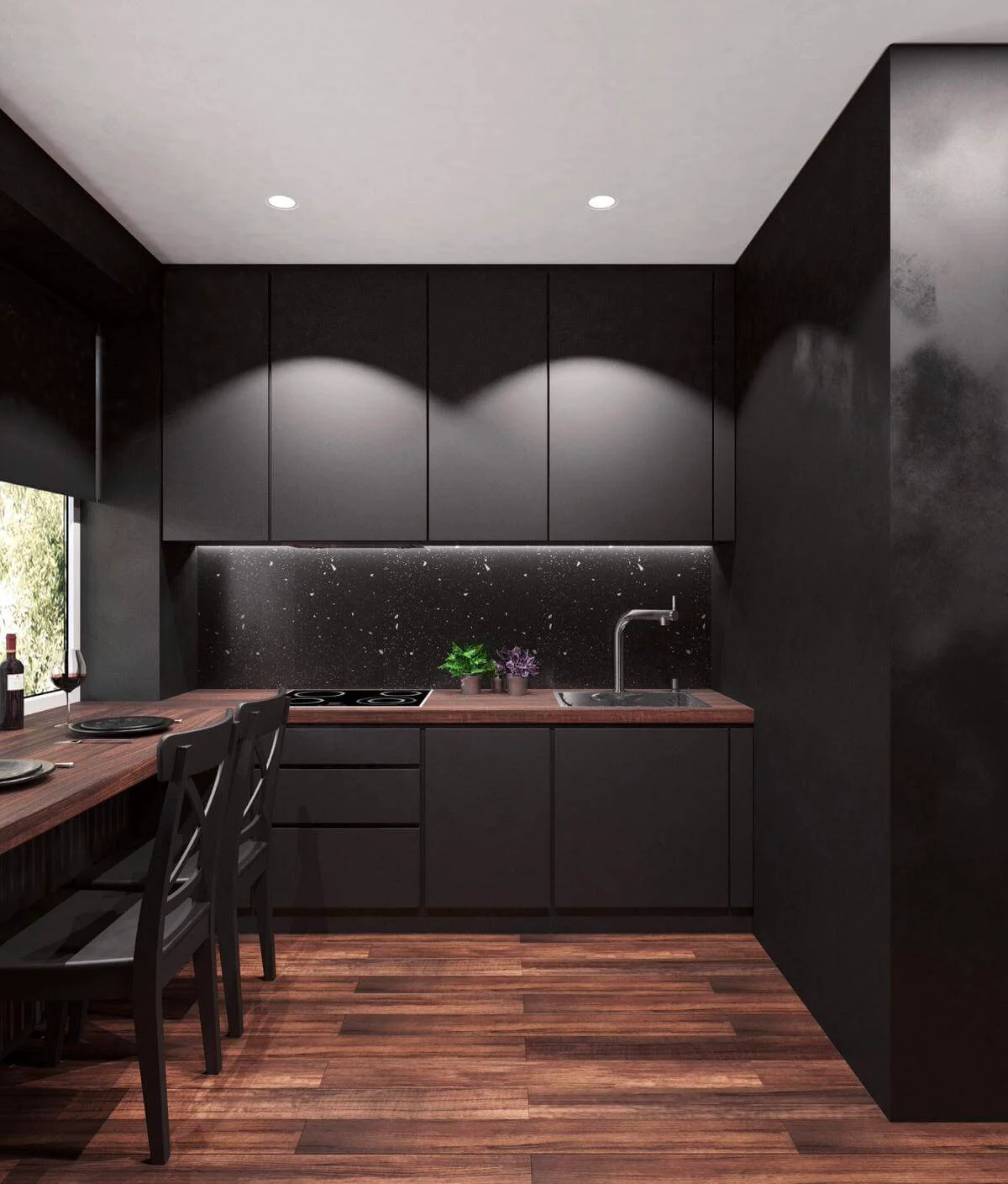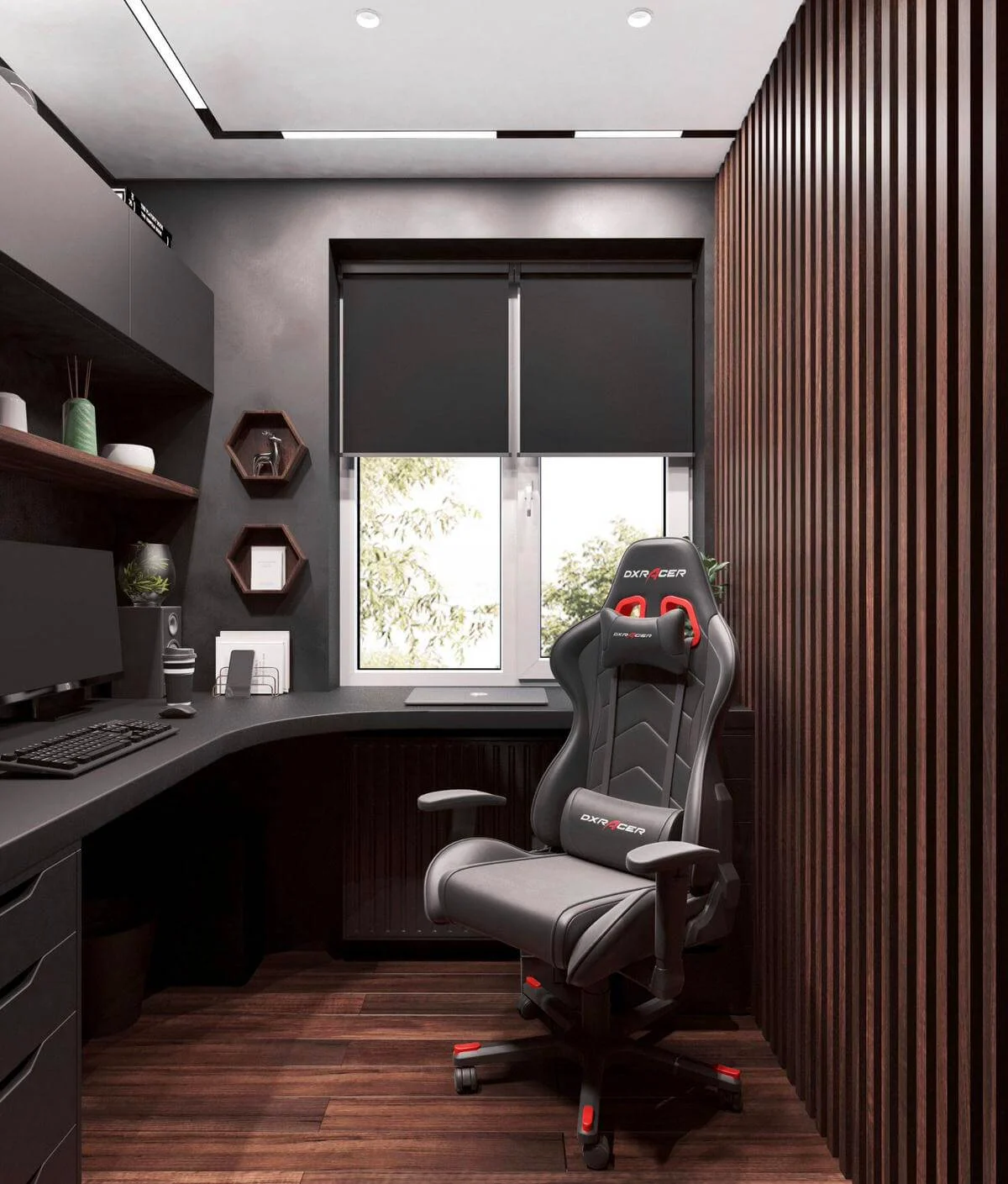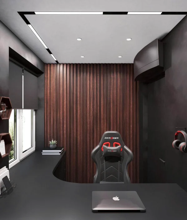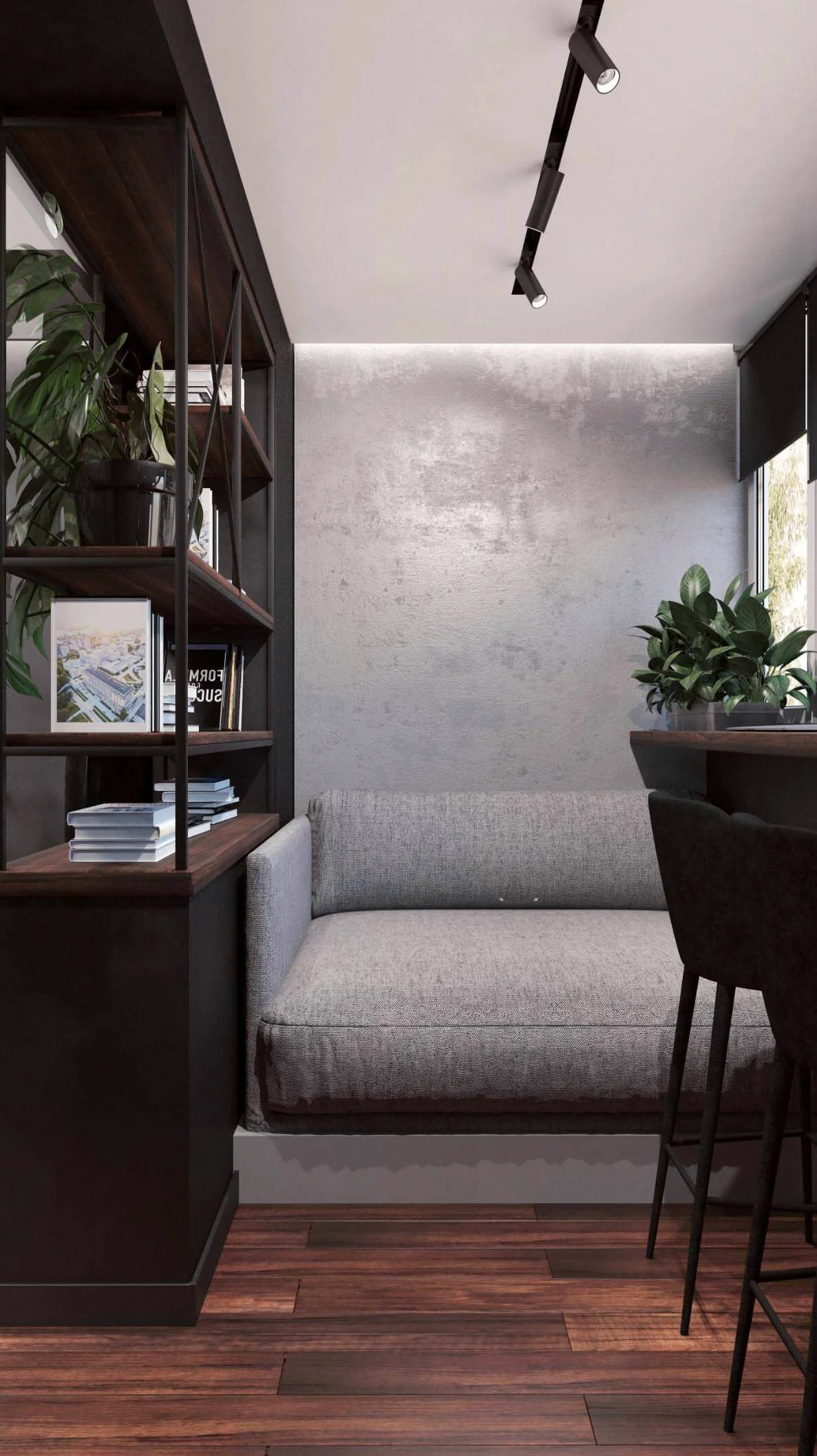 Стены обработаны мебельными панелями и декоративной штукатуркой, что придает разнообразие фактур и натуральность в пространстве